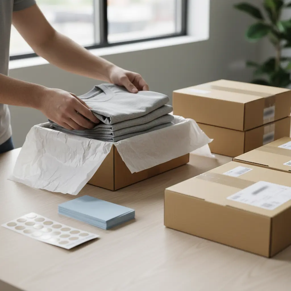 A close-up view of an apparel packing station where garments are wrapped with tissue paper and inserts before being placed into shipping boxes. The image reflects attention to presentation and brand consistency across every outbound order.