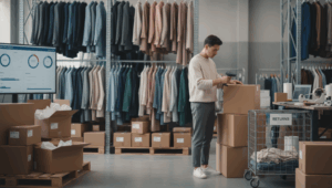 Image of a modern fashion logistics operation inside a clean warehouse. A logistics associate scans a shipping carton while hanging garments, stacked boxes, and a blurred WMS/OMS dashboard represent inventory accuracy, cross-border shipping, and returns management for apparel brands. The scene highlights how tech-enabled fashion logistics protects margins and customer experience.